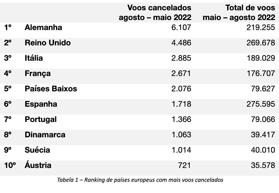 De acordo com este estudo, elaborado pela AirHelp, o top dez é liderado pela Alemanha, cujos aeroportos cancelaram um total de 6.107 voos. Em segundo lugar, encontra-se o Reino Unido com 4.486 voos cancelados. Itália (2.885 voos cancelados), França (2.671 voos cancelados), Países Baixos (2.076 voos cancelados) e Espanha (1.718 voos cancelados) encontram-se nos lugares acima de Portugal. Dinamarca, Suécia e Áustria encontram-se nos lugares abaixo de Portugal, com 1.063, 1.014 e 721 voos cancelados, respetivamente.